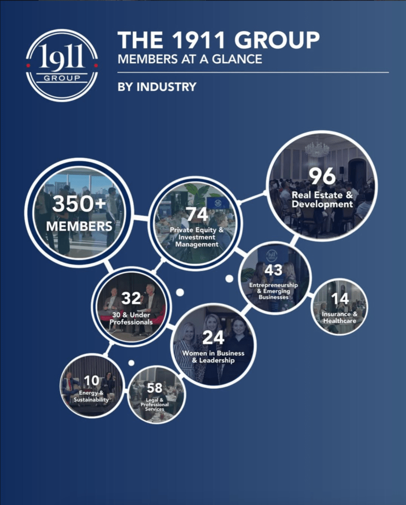 Developed a visual breakdown of 1911 Group membership by industry to communicate the strength and diversity of the network. Used as a strategic marketing asset to position the organization to prospective members and partners.