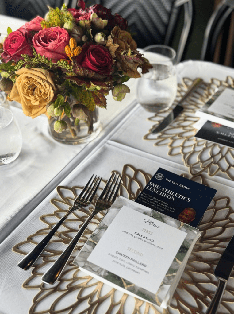 SMU Athletics Luncheon: Partnered with the Park House event team to execute a high-profile SMU Athletics luncheon, overseeing event logistics, menu selection, table design, and fireside chat coordination. Managed microphone and TV setup to ensure a seamless in-person experience while capturing high-quality digital content.
