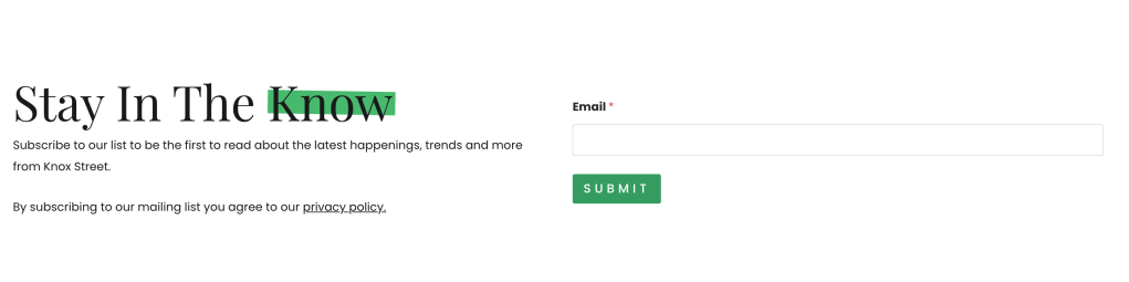 Led rollout of Knox Street’s email marketing initiative, launching a website-integrated signup experience to drive subscriber growth and support ongoing brand communication.